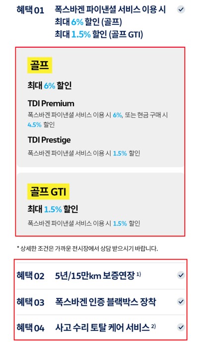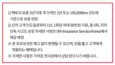 폭스바겐에서 제시하는 프로모션도 마찬가지예요. 하나하나 끝까지 천천히 읽어보시고 득인지 실인지 살펴보세요. 혜택 02번의 경우에는 5년/15만 km로 나와있지만 추가 금액을 내고 나서야 5년/15만km을 보장해주는 겁니다.