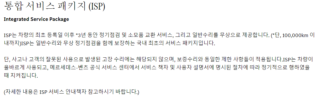 괄호 1)을 읽어보면 3년 이후 추가적인 2년 또는 15만km 선도래 기준으로 보증 연장이라는 문장이 보이죠. 3년까지는 무상보증이었다가 추가 금액을 내면 2년을 연장해 준다는 겁니다. 벤츠의 경우 볼까요? 벤츠는 통합서비스 패키지 (ISP)로 명칭 하며 3년 동안 정기점검 및 소모품 교환 서비스와 일반서비스를 무상으로 제공하게 됩니다.